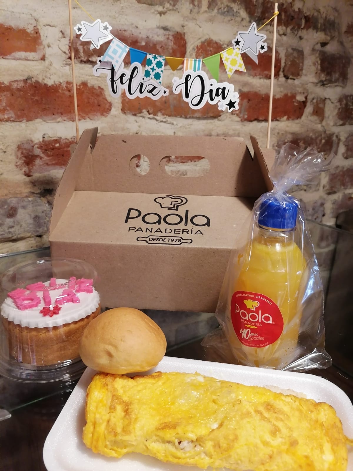 Contenido: Omelette con pan, Jugo de naranja natural, Mini torta personal de naranja.