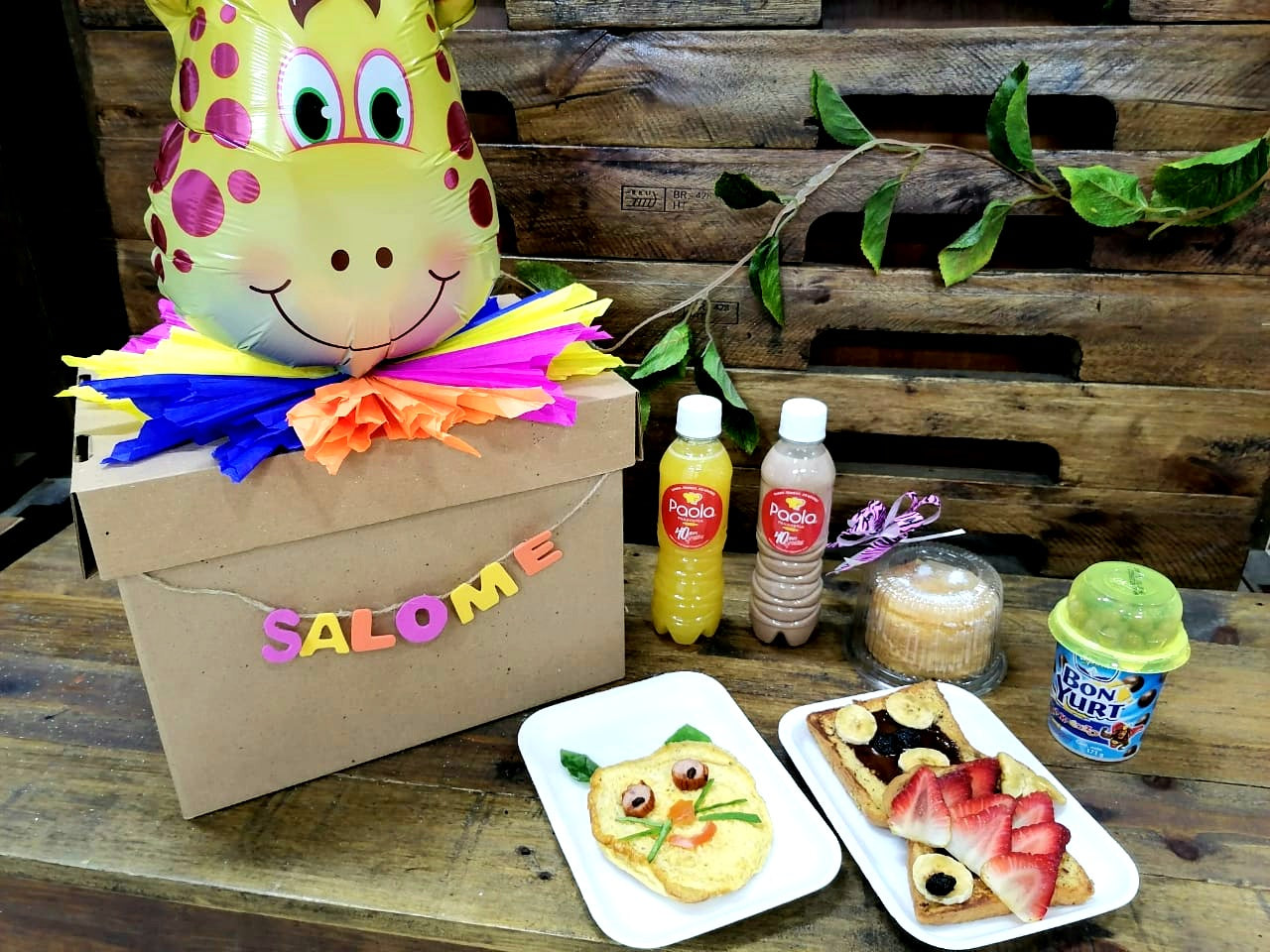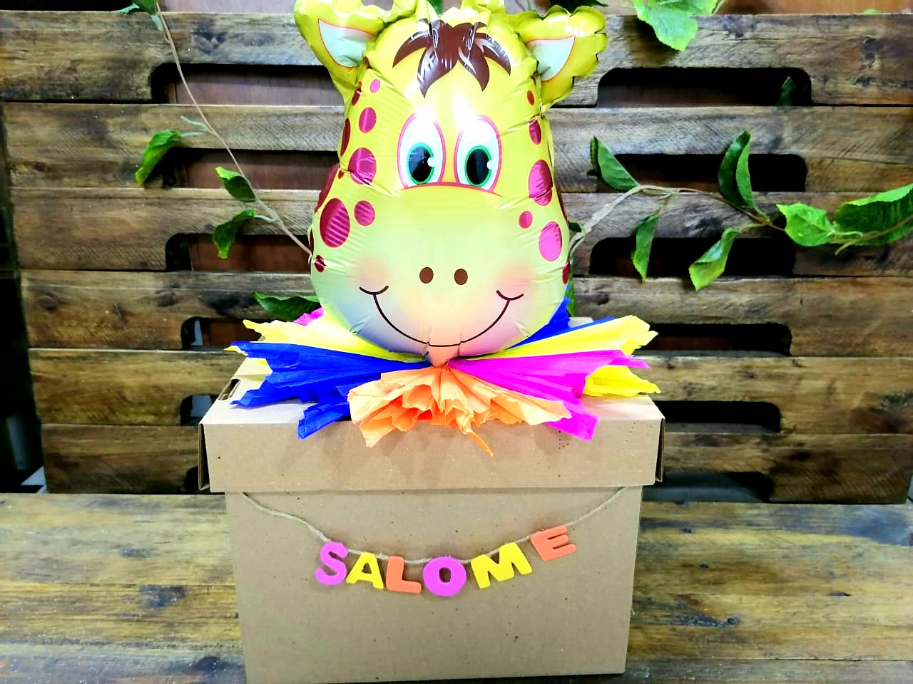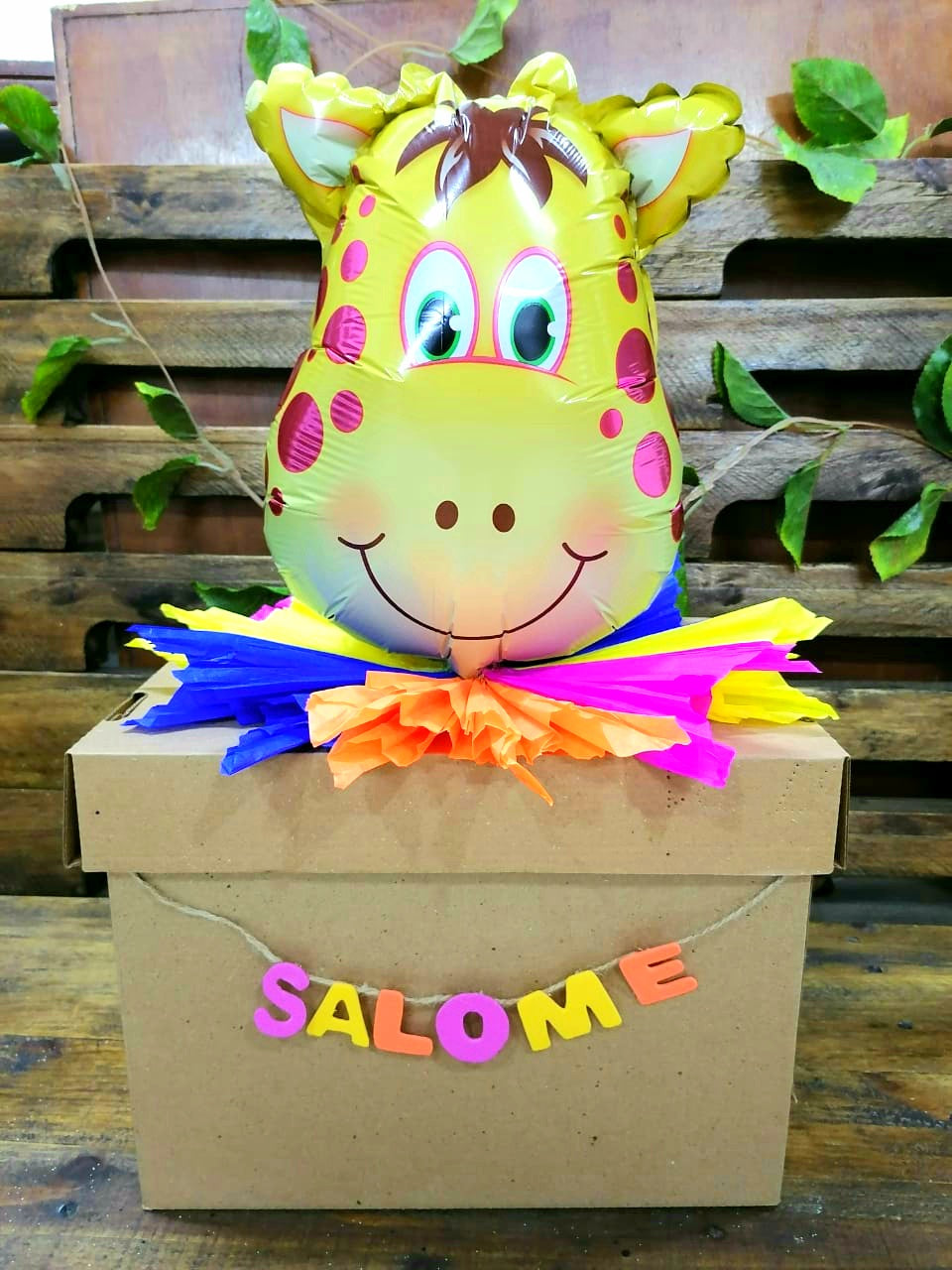 Empacado todo individual, en caja de cartón con decoración colorida y globo de animalitos y nombre de colores!