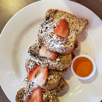 Rebanadas de pan 8 granos remojadas en huevo, doradas en sartén y decoradas con fresas, banano y un toque de miel. Dulces, suaves y perfectas para un desayuno especial.