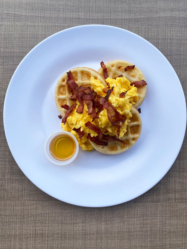 Tres Waffles de pandebono acompañados de tocineta crocante, huevos revueltos y un chorrito de miel. Una combinación perfecta de salado y dulce que llena de energía la mañana.